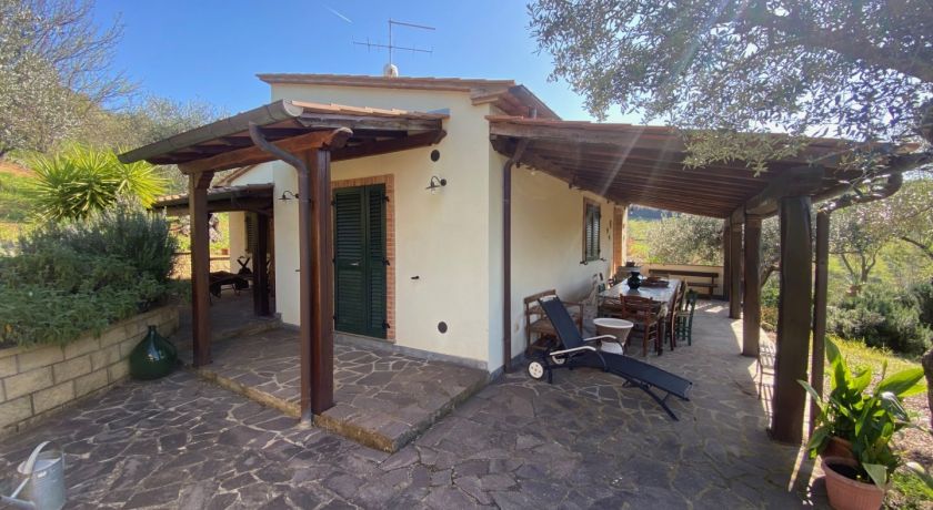 Casalino di nuova costruzione in bella posizione panoramica composto da ingresso/soggiorno con camino,cucina due camere matrimoniali,due bagni e ripostiglio.Al piano interrato garage con cantina e bagno.Aria condizionata,impianto fotovoltaico,pozzo,forno.Il terreno รจ di 3,5 ad olivi e frutti.